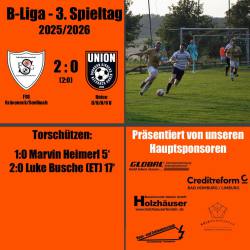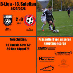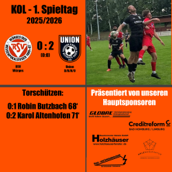 Neugründung, zwei Spielgemeinschaften müssen sich finden, „nur“ 4 Wochen Vorbereitungszeit und ein Gegner, der nach der „Last-Minute-Rettung“ in der Relegation der letzten Saison sich personell stark verändert hat. Dementsprechend konzentriert startete die Union in das Spiel, in dem Cheftrainer Walter Reitz sein Team im Vergleich zum letzten Testspiel nur auf einer Position änderte. Noah Schrot von Beginn an für Daniel Helfenstein. Kein großes Abtasten beider Teams zu Beginn, die Partie mit einem flotten Start, in der Nico Brands bereits nach 5 Minuten das erste Ausrufezeichen für den Gastgeber setzt. Sein Schuss aus 16 Meter wird länger und länger, Yannik Großmann gleich gefordert und spitzelt das Leder gerade noch so am linken Pfosten vorbei. Klasse Aktion von Beiden. Auch die Gäste gleich im Spiel, aber es dauert gut 20 Minuten, ehe Nils Wettengl den guten Schlussmann des RSV, Ademola Taiwo Adejemi, aus kurzer Distanz zu einer Glanztat zwingt. Danach viele intensive Zweikämpfe, zählbares springt für beide Teams nicht dabei heraus. Der RSV mit vielen hohen Bällen, die Abwehr-Chef Nico Schneider vor nicht allzu große Probleme stellen und die Gäste mit Offensivbemühungen, aber die Bälle „in die Box“ werden zu schlampig zu Ende gespielt. Quasi mit dem Pausenpfiff bleibt den zahlreich angereisten Gästefans der Torjubel im Hals stecken. Die Union zeigt dieses Mal ihre Qualität. Der Ball über Nils Wettengl und Karol Altenhofen landet bei Volkan Subasi, doch sein Knaller aus zentraler Position vom 16er geht knapp über das Tor. Es musste eigentlich die Führung sein. Halbzeit. Die nicht übermittelte Ansprache von Walter Reitz in der Pause zeigte Wirkung, denn die Gäste zu Beginn des zweiten Durchgangs klar spielbestimmend und mit sehr guten Möglichkeiten. Zunächst setzt sich Lukas Scheu im 1vs.1 glänzend durch, doch er kann nicht den nötigen „Schmackes“ in den Abschluss stecken und der Ball wird zur sichern Beute von Heim-TW Adejemi. Nur 2 Minuten später kommt Nico Schneider 5 Meter vor dem Tor der Gastgeber an den Ball, doch sein Drehschuss wird gerade noch abgeblockt. Würges bleibt nach wie vor nur bei Standards gefährlich, die aber sicher von Union Schlussmann Yannik Großmann „abgepflückt“ werden. Nach gut einer Stunde dann ein 3fach Wechsel auf Seiten der Gäste und sofort tritt die Union noch einmal auf das Gaspedal. Folgerichtig die Führung. „Youngster“ Karol Altenhofen tankt sich in den 16er der Gastgeber und kann nur durch ein Foul gestoppt werden. Kaum Proteste der Heimelf, der gerade eingewechselte Robin Butzbach legt sich den Ball zurecht und verwandelt zur umjubelten Führung für die Gäste. RSV-Schlussmann Ademola Taiwo Adejemi ahnte zwar die Ecke, hat aber gegen den platzierten Schuss keine Abwehrmöglichkeit. Nur 3 Minuten später das 0:2. Daniel Helfenstein bereitet über Rechtsaußen mustergültig vor und der immer stärker werdende Karol Altenhofen verwandelt in Bedrängnis 8 Meter vor dem Tor, der Ball noch leicht abgefälscht. Nur eine Zeigerumdrehung später fast das 0:3. Wieder war es Altenhofen der über links einen seiner schnellen Vorstöße ansetzt, das Leder aber zum Abschluss an die Latte knallt. Die Union jetzt auf erhöhter Betriebstemperatur. Lediglich der agile Nico Brands auf Seiten des RSV hätte es noch einmal spannend machen können, doch nach einem tollen Pass in die Schnittstelle der Union-Abwehr setzt er das Leder knapp am Gehäuse vorbei. Kurz danach forderte die Heimelf einen Strafstoß nach einer ähnlichen Situation, die zum 0:1 führte, doch der Unparteiische bewertete die Aktion ganz anders und der erhoffte Pfiff für den RSV blieb aus. Bis zum Schluss ändert sich dann nichts mehr und die Gäste holen in ihrem ersten Punktspiel als Union, aufgrund der Leistungssteigerung in der 2. Halbzeit, nicht unverdient 3 Punkte.
