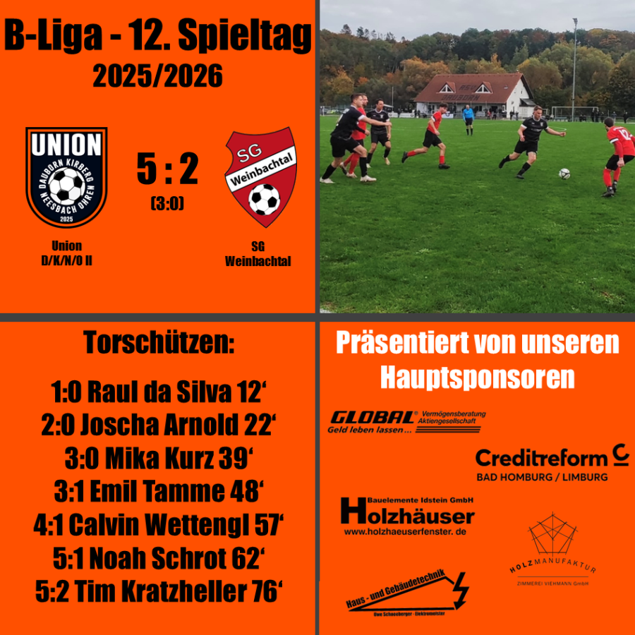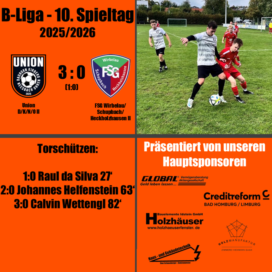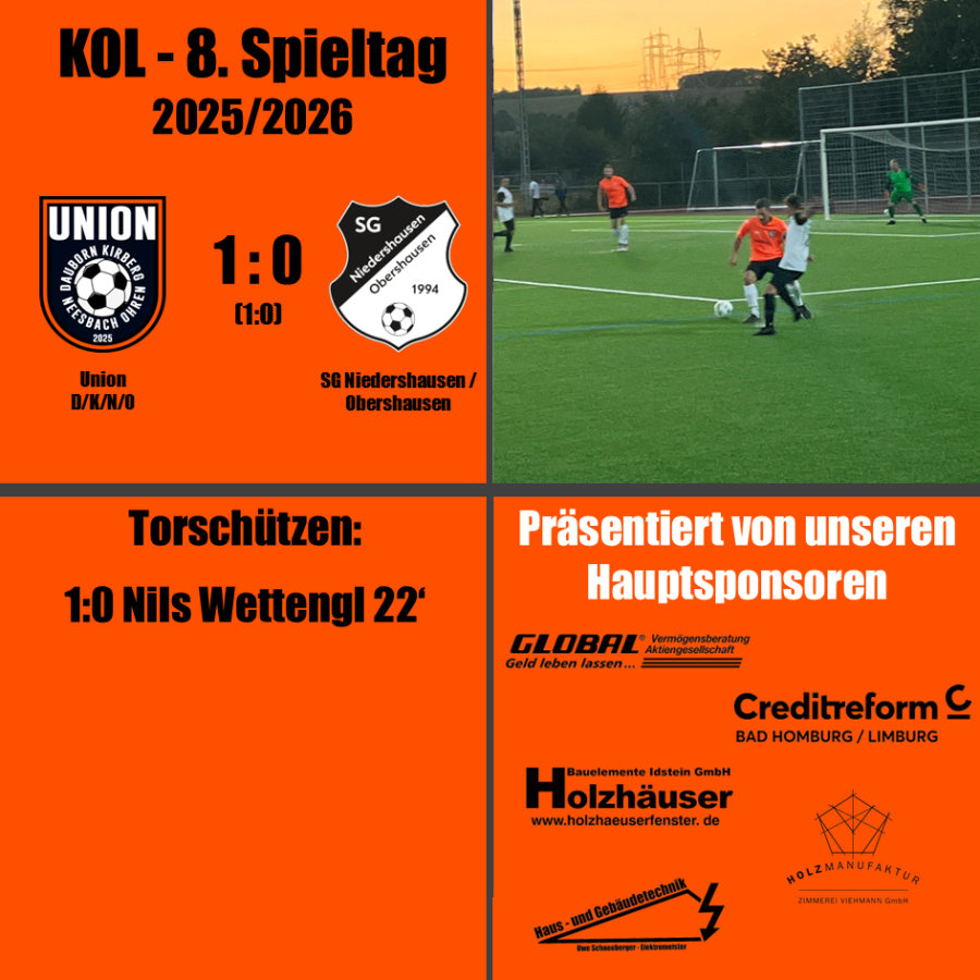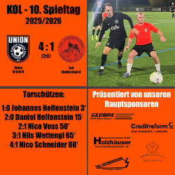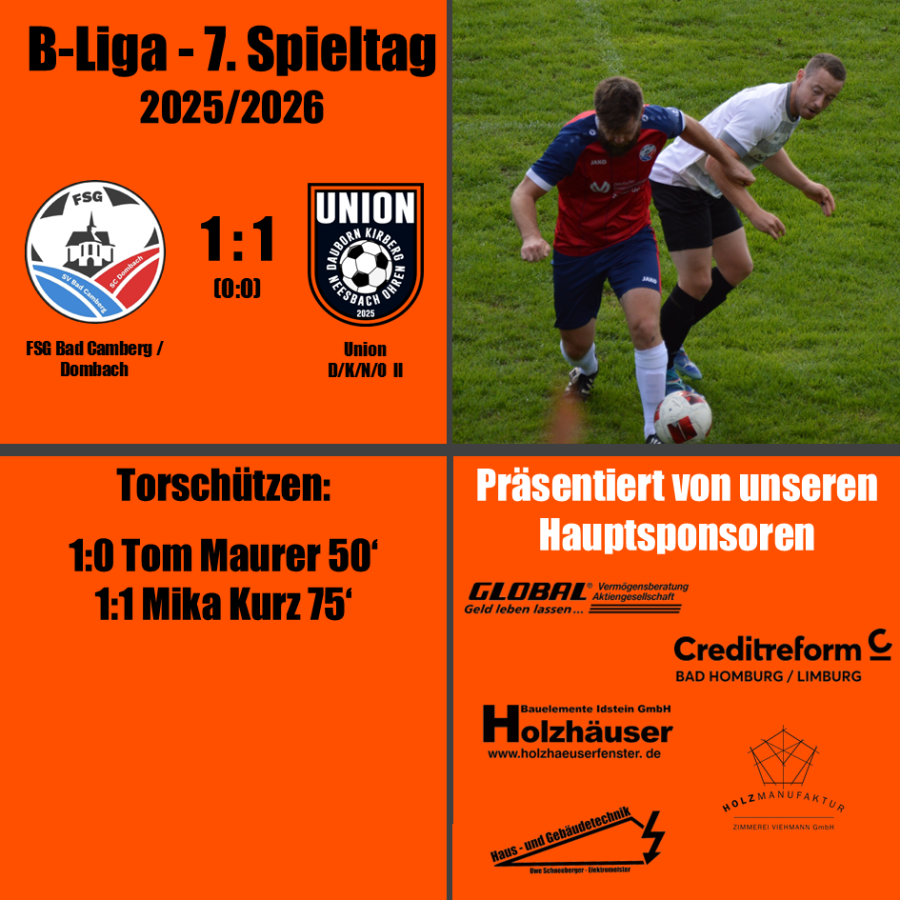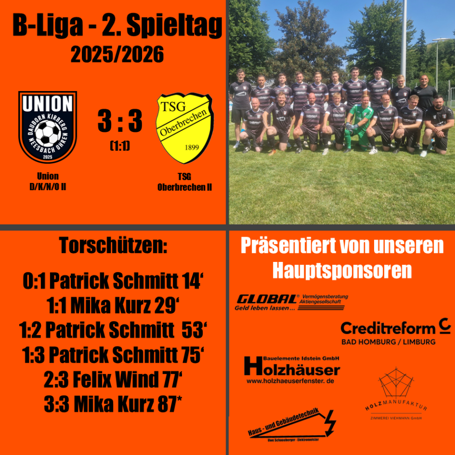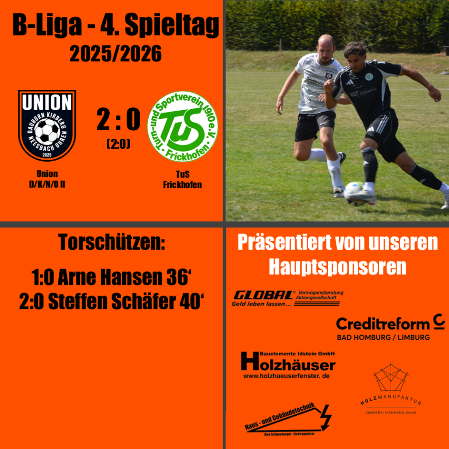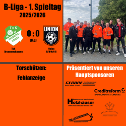 Auf dem frisch instand gesetzten Rasenplatz in Drommershausen trafen am Sonntag der TuS Drommershausen und die zweite Mannschaft der neu gegründeten Union Dauborn/Kirberg/Neesbach/Ohren aufeinander. Beide Teams lieferten sich ein intensives und engagiertes Duell, das am Ende torlos, aber keineswegs ereignislos blieb. In der ersten Halbzeit tasteten sich beide Mannschaften zunächst vorsichtig ab, wobei die Gäste insgesamt den etwas gefährlicheren Eindruck hinterließen. Ben Köppel hatte dabei die beste Gelegenheit für die Union, als sein Distanzschuss nach ca. 30 Minute nur die Latte traf – Christian Keppler im Tor des TuS wäre machtlos gewesen. Drommershausen kam dagegen selten gefährlich vor das gegnerische Tor, da die Gäste stark und diszipliniert verteidigten. Nach dem Seitenwechsel erhöhten beide Teams das Tempo und die Partie wurde offener. André Müller sorgte auf Seiten der Hausherren für mehr Offensivdruck und hatte in der ca. 80. Minute Pech, als sein Schuss nur den Pfosten küsste. Die Union blieb jedoch weiter gefährlich: Laurenz Müllers Bogenlampe landete in der Schlussphase auf der Oberkante der Latte – auch hier war das Aluminium ein Spielverderber. Kurz vor dem Ende wurde es dann nochmals brenzlig für die Gäste. In der 88. Minute wurde André Müller stark in Szene gesetzt, doch Marcel Mäuer im Tor der Union zeigte eine Glanzparade und lenkte den Ball reaktionsschnell zur Ecke. Eine Szene, die sinnbildlich für die gute Torwartleistung und die geschlossene Defensivarbeit der Gäste stand. Nach 90 umkämpften Minuten pfiff der souverän leitende Schiedsrichter Yücel Zenbil – der mit einer fehlerfreien und unaufgeregten Leistung überzeugte – die Partie ab. Damit holte die Spielgemeinschaft Union D/K/N/O II nicht nur ein verdientes Unentschieden, sondern zugleich den ersten Punkt der Vereinsgeschichte. Fazit: Ein torloses Remis, das vor allem durch Aluminiumtreffer und starke Torhüterleistungen geprägt war. Der TuS Drommershausen wird mit den vergebenen Chancen hadern, während sich die Union über einen gelungenen Start in ihr erstes Kreisliga-Kapitel freuen darf. Unter dem Strich ein gerechtes Remis.