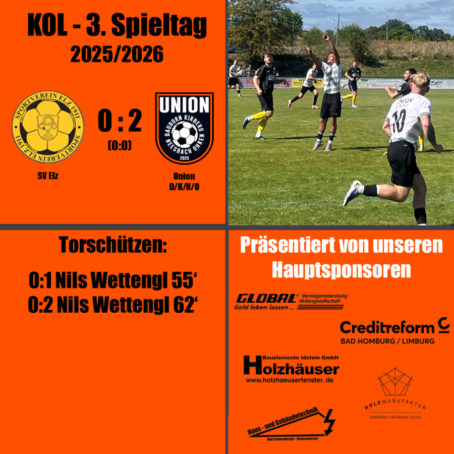 Am Sonntag reiste die Mannschaft von Walter Reitz zum Ligaspiel nach Elz. Die Voraussetzungen vor dem Spiel waren klar: Beide Teams brauchten einen Sieg, um nicht schon früh in der Saison in die Niederungen der Tabelle abzurutschen. Die Gastgeber vor dem Spiel mit einem Punkt auf der Habenseite, die Gäste mit deren Drei. Das Reitz-Team auf drei Positionen zum Spiel gegen Oberbrechen geändert – für Nicolai Campana, Robin Butzbach und Volkan Subasi spielten Jakob Dombach, Daniel Helfenstein und Karol Altenhofen von Anfang an. Und eine Sache vorweg: Und die Youngster Jakob und Karol im Union-Dress machten ein starkes Spiel. Zu Beginn zwei sehr gute Möglichkeiten für die Kombinierten, wobei gerade Nummer 2 sau stark von Nils Wettengl über die rechte Seite vorbereitet wurde, ein kluger Pass auf Daniel Helfenstein, aber er bekommt nicht genug Druck auf den Schuh. Danach die Gäste etwas verhalten und die Elzer mit guten Möglichkeiten. Zunächst scheitert Linus Göller mit einem Flachschuss am gut aufgelegten Union Schlussmann Yannick Grossmann – dieser fischt das Leder gerade noch so aus der linken, unteren Torecke- und zeigt bei einem Freistoß von Louis Schenk aus 20 Meter kurz vor der Pause, noch einmal sein ganzes Können. Die dickste Möglichkeit vergab aber Muhammed Alkan, der nach einem „Luftloch“ von Gästeschlussmann Grossmann, die sich daraus bietende Möglichkeit zum 1:0 leichtfertig vergab. Die Ansprache in der Pause durch Union Trainer Reitz muss einen ähnlichen Inhalt wie die bei der Partie in Würges gehabt haben, denn seine Mannschaft nun mit viel mehr Engagement, Leidenschaft und Druck nach vorne auf dem Platz. Der eingewechselte Volkan Subasi sorgte dann indirekt für die verdiente Führung. Eine seiner schnellen Vorstöße über links und der anschließende Ball in die Mitte wurde mit ausgestrecktem Arm eines Elzer Abwehrspielers gestoppt und folgerichtig ertönte der Pfiff des Unparteiischen: Handelfmeter. Wenig Proteste auf Seiten der Heimelf, zu eindeutig die Situation und der Schiedsrichter hatte freie Sicht. Neuzugang Nils Wettengl übernahm Verantwortung, schickte Schlussmann Leon Schmitt in die falsche Ecke und schweißte links unten ein. Die schönste Aktion des Spiels nur gut 7 Minuten später. Ein „doppelter Doppelpass“ im Vollsprint über den Platz zwischen Nils Wettengl und Daniel Helfenstein und sehenswert der Abschluss des Mannes mit der Nummer 10 im Dress der Union. Anschließend verflacht die Partie ein wenig, wahrscheinlich den Temperaturen und vielen kleinen Unterbrechungen incl. Trinkpause, geschuldet. Die Aktionen der Gäste nicht mehr so zielstrebig, was den Gastgebern sogar noch einmal die Möglichkeit zum Anschlusstreffer bringt. Doch Yannick Grossmann ist an diesem Tag nicht zu bezwingen. Durch eine geschlossene Mannschaftsleistung, in der Kapitän und Abwehrchef Nico Schneider herausragt, kann die Union verdient den nächsten Dreier einfahren. Am kommenden Sonntag kehrt mit Hans Mattersberger ein „alter Bekannter“ zurück in die Kornbrenner-Metropole nach Dauborn. Und da ist Vorsicht geboten. Seit dem letzten Sonntag ist auch der RSV Weyer in der Saison angekommen und schickte nach 2 bitteren Niederlagen zu Saisonbeginn, die Gäste der SG Nord, mit einer 6:2 Klatsche auf die Heimreise. (D.B.)